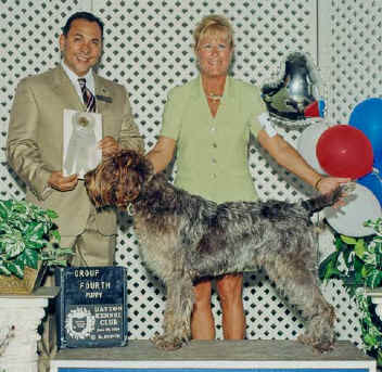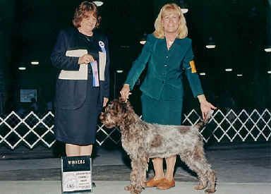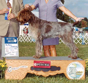 Ted E was whelped on 8-26-03. There were 9 pups in the litter. All nine pups came into the world wagging their tails! To this day, the only time Ted E. stops wagging his tail is when he is on point. At five months of age, we took Ted E and Daz out in the field. Ted E was amazing! His first day out he got one pheasant and 2 chukars. Ted E took his first point at the Louisville dog show at the age of 6 months and 3 days out of the Bred By Exhibitor class. He went Best of Winners for 4 days in Kalamazoo in May at 8 months of age, and went Best of Breed for 3 days in Lexington at 1 year old. Ted E is full of energy and has a tremendous reach in the ring. Yet, in the house, he is content to lay by our feet.